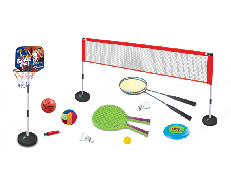 Set sport multifunctional 5 in 1 Alibibi ce contine cos minge baschet, rachete badminton, fileu