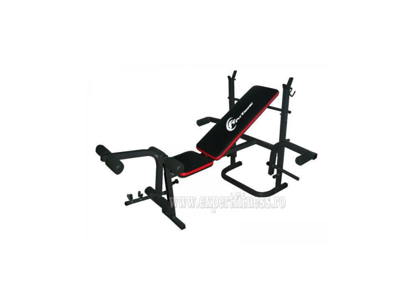 O banca multifunctionala, cu suport pentru cu bara reglabil pe inaltime. In afara de exercitiile cu bara, puteti face si exercitii la manerele paralele (datorita manerelor de pe suporti de bara reglabili).