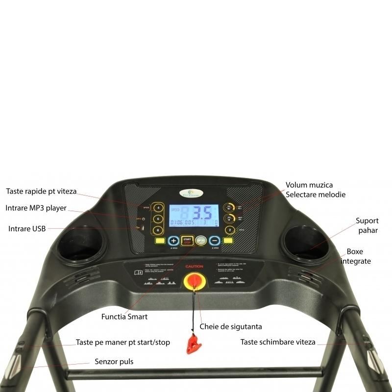 Banda de alergat electrica BodyFit A5000, motor 3.25 CP, greutate suportata 130 kg, inclinatie electrica 15%, viteza maxima 16 km/h, mp3, USB