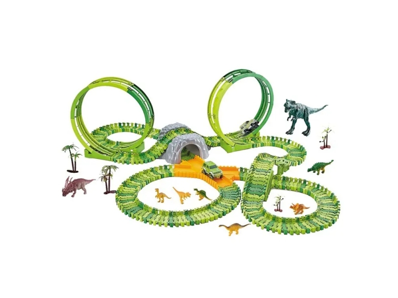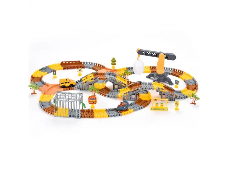 Pista de masini AliBibi cu dinozauri, 271 piese incluse, doua masinute, figurine cu dinozauri, macara