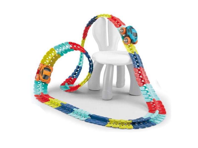 Pista de curse are sectiuni flexibile, realizate dintr-un plastic rezistent, ceea ce ofera posibilitatea de a le aranja in toate formele dorite, ele putand fi rotite si la 360 grade. Are un design modern si este adorat de toti copiii. Pista include doua masinute luminate.