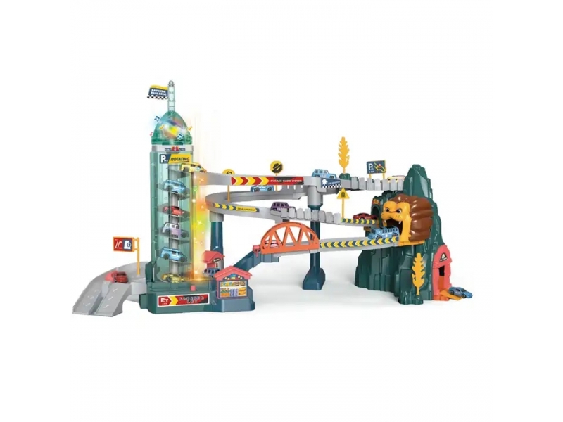 Pista de masini supraetajata AliBibi, masinute incluse, tunel cu leu, lift automat, parcare si service auto